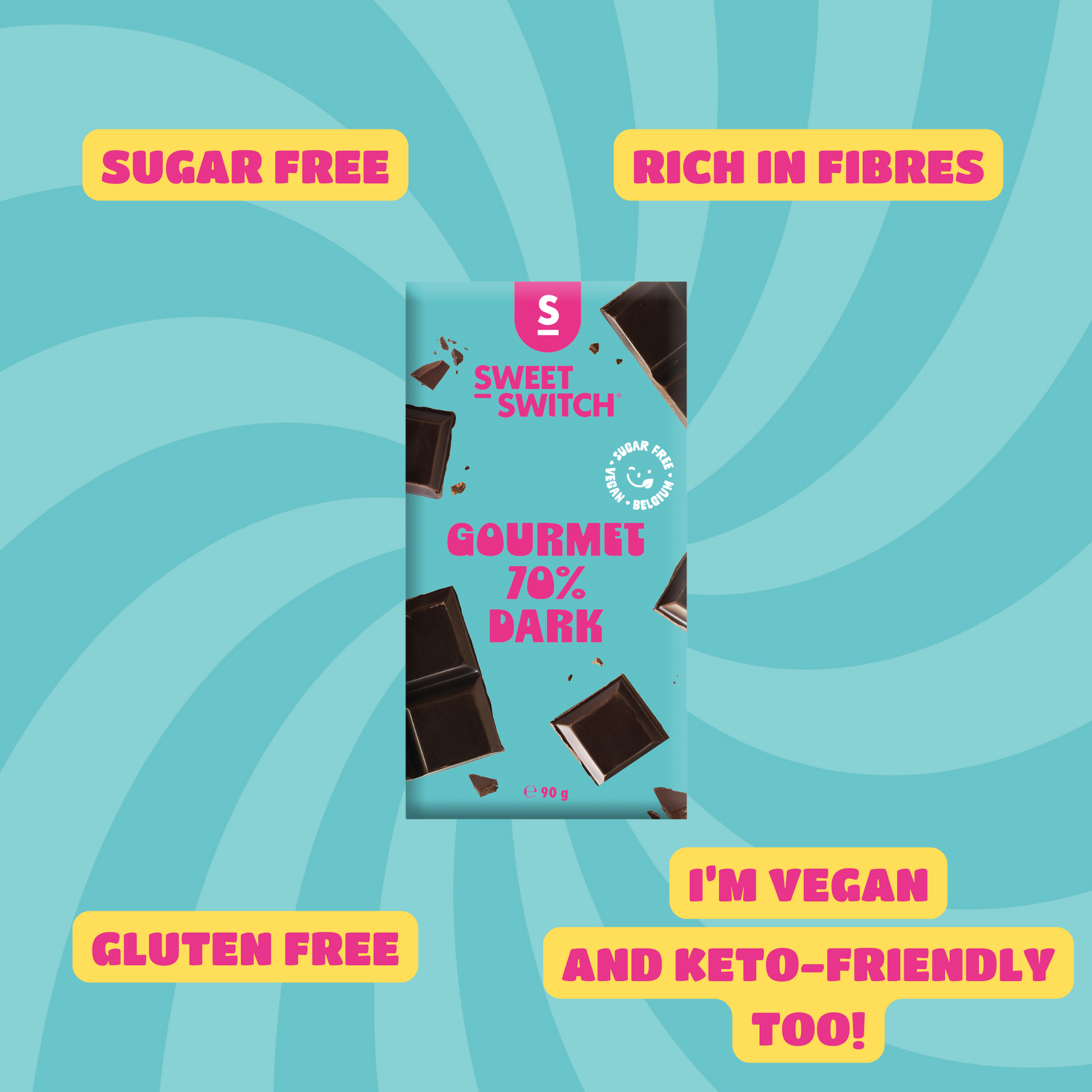 Indulge in our signature dark chocolate! 70% pure cocoa, free from sugar, gluten and palm oil. Rich, smooth and irresistibly pure.
